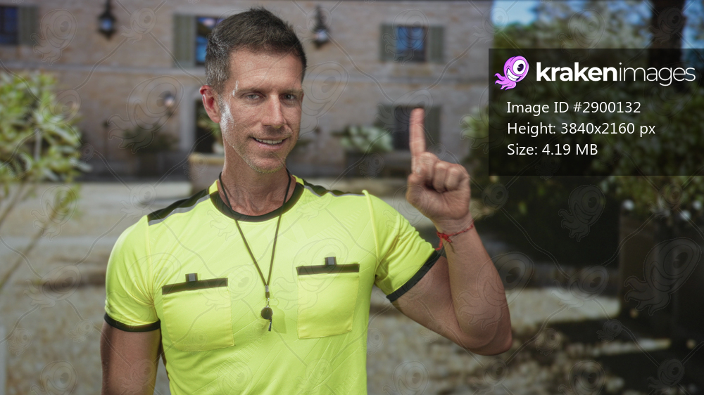 Man points index finger at building entrance wearing neon referee shirt and whistle visible; authority instruction.