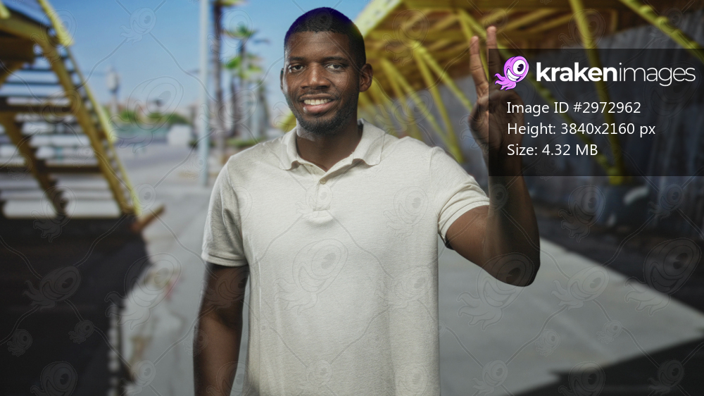 Man points index finger on a sunlit street beside a yellow staircase and boardwalk, wearing a white polo shirt and smiling while raising right hand; confidence. - Kraken Images