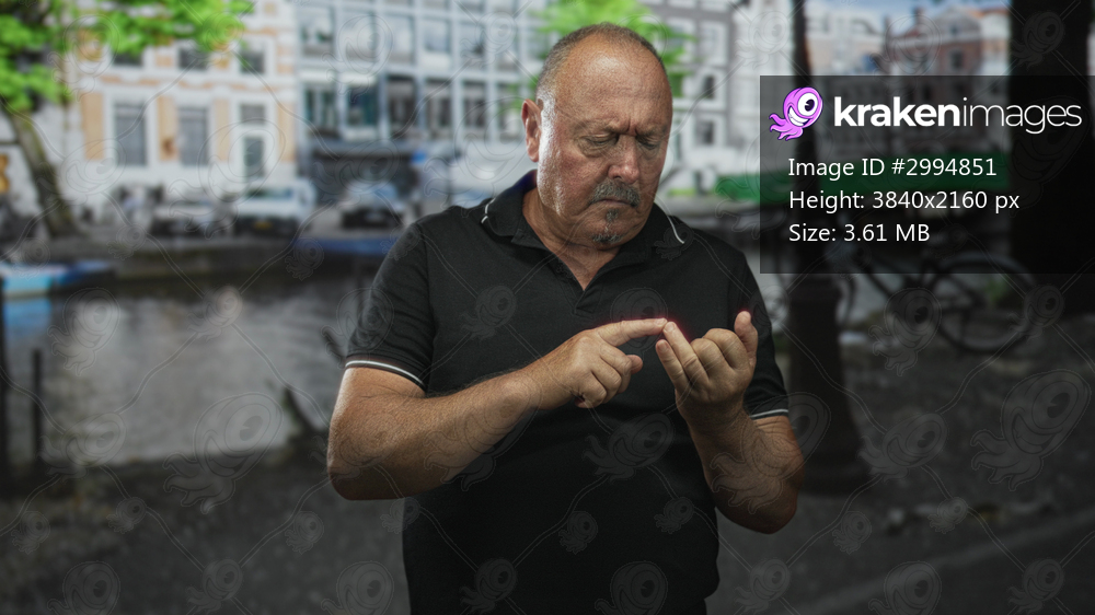 Man points index finger to palm while counting on his fingers on a canal street with bicycles and buildings; concern reflection.