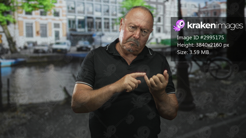 Man points index finger to palm while counting on his fingers on a canal street with bicycles and buildings; concern reflection.