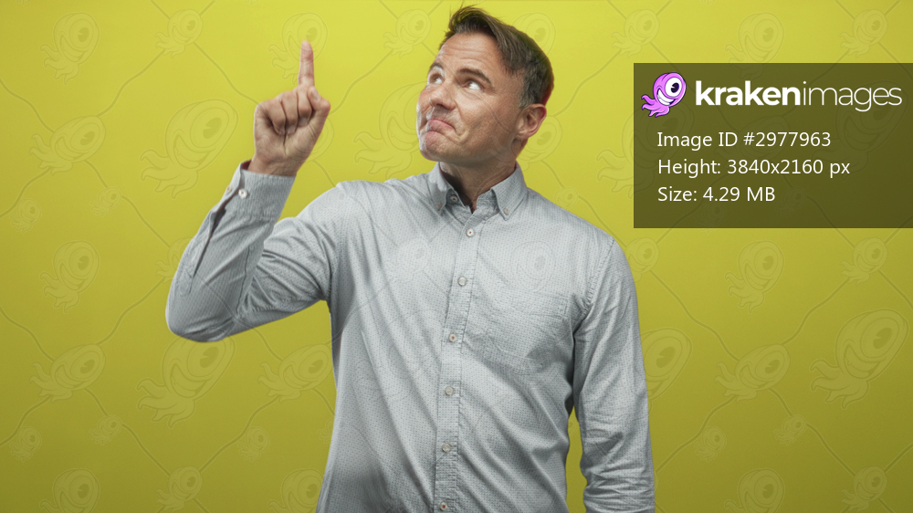 Man points index finger up, hand raised, smiling and wearing a buttoned shirt in studio; inspiration optimism.
