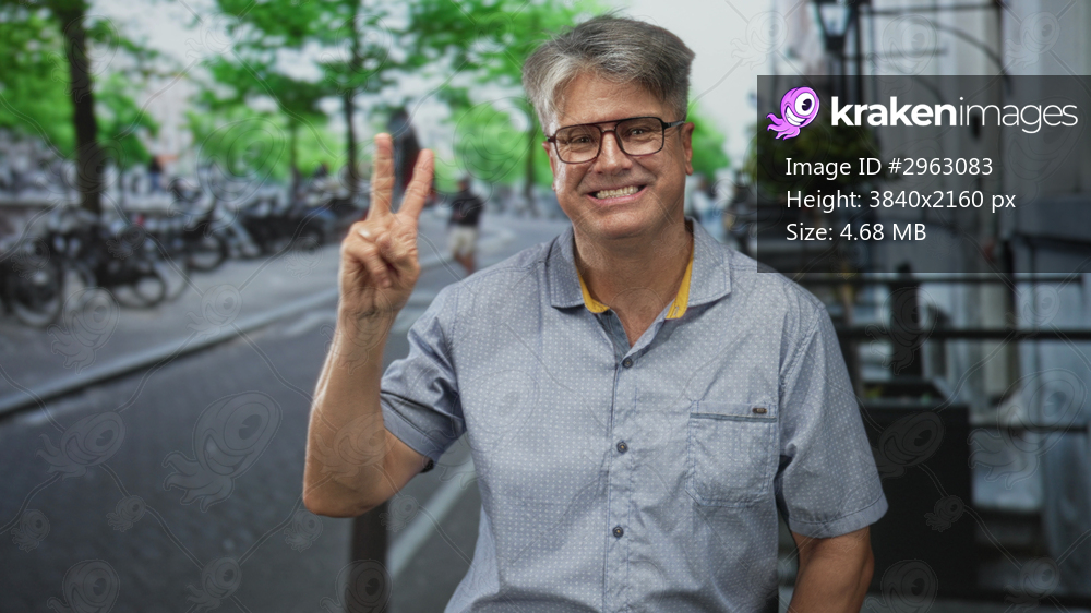 Man points index finger up on a tree lined urban street with parked bicycles and sidewalk cafe, smiling while gesturing; confidence.