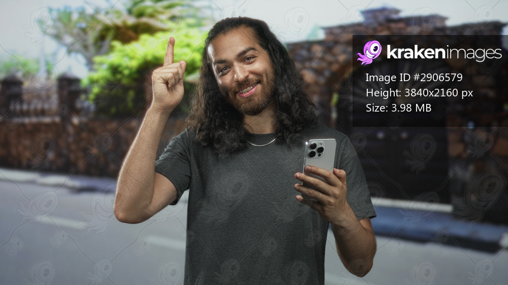 Man points index finger up while holding smartphone at a house entrance on street, smiling and engaging with camera; cheerful connection.
