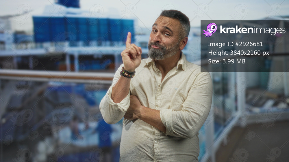 Man points index finger upward on cruise ship deck with crossed arms, bearded middle aged hispanic wearing bracelets and casual shirt near railing; confident charm. - Kraken Images