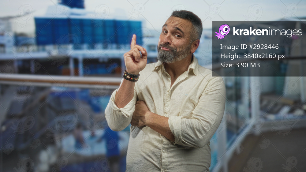 Man points index finger upward on cruise ship deck with crossed arms, bearded middle aged hispanic wearing bracelets and casual shirt near railing; confident charm. - Kraken Images