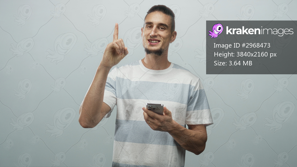 Man points index finger upward while holding smartphone and smiling, wearing striped t shirt in studio; optimism curiosity.