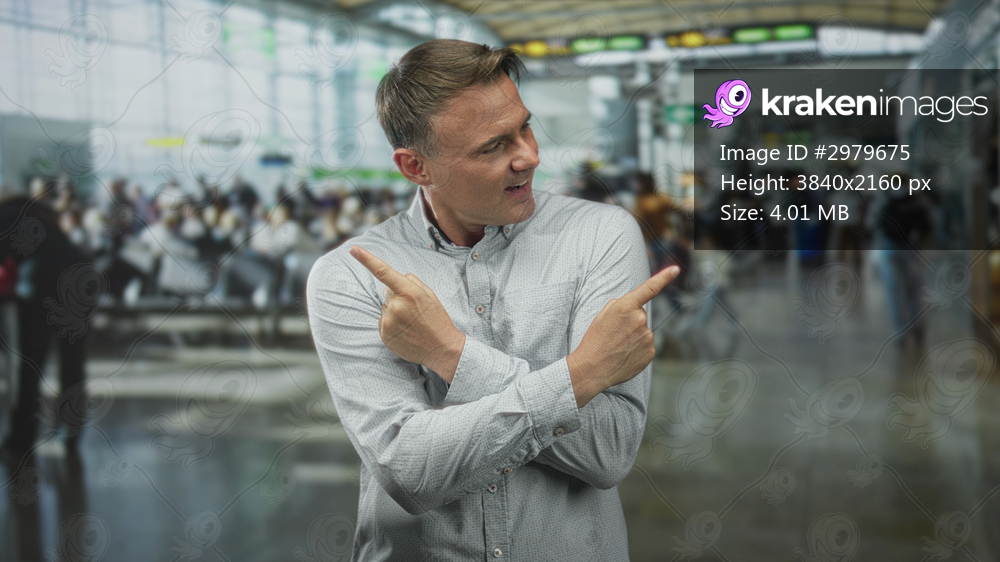 Man points index fingers both directions at airport signage while crossing arms and smiling, hands visible; decision uncertainty.