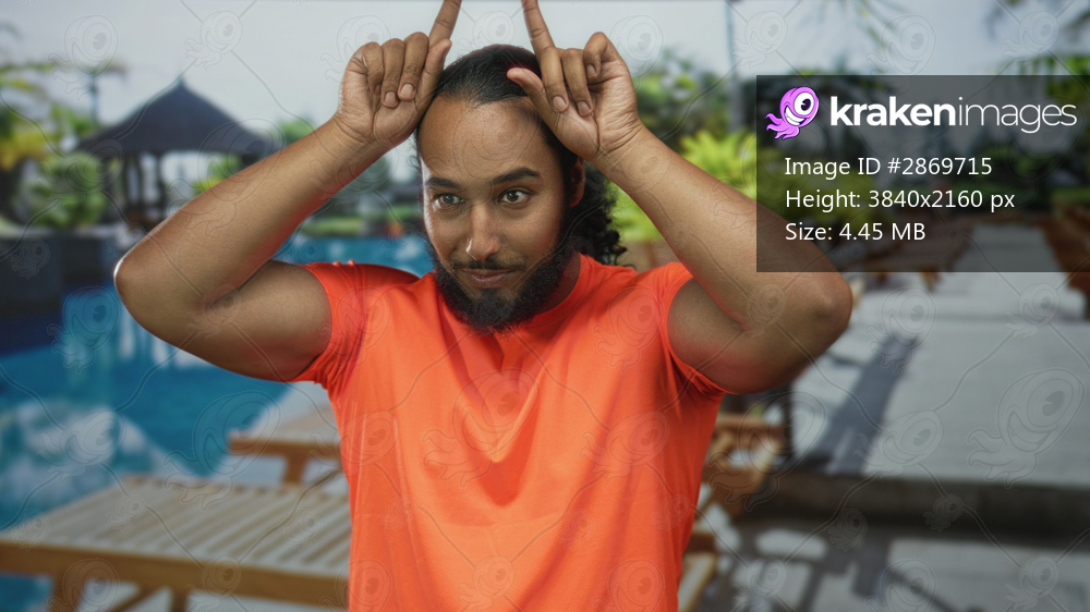 Man points index fingers to head at resort pool in orange shirt smiling beside sunlit lounge chairs and gazebo; playful vacation fun.