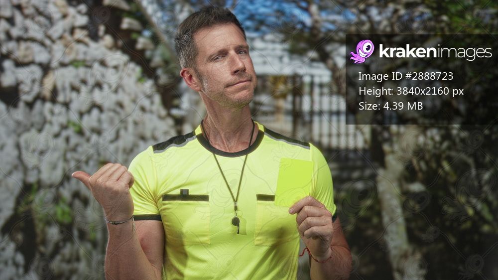 Man points thumb and holds yellow card by stone gate at building entrance; rule enforcement authority sports.