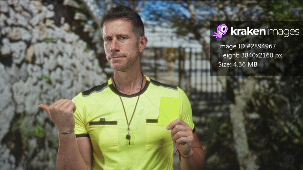 Man points thumb and holds yellow card by stone gate at building entrance; rule enforcement authority sports.