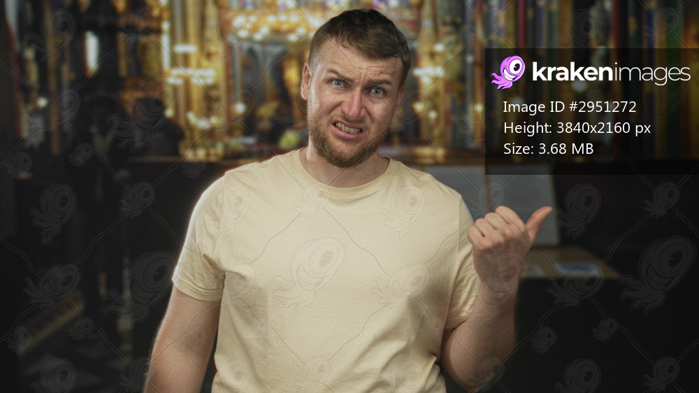 Man points thumb over shoulder in church building with a puzzled grimace and skeptical posture; annoyance skepticism doubt.