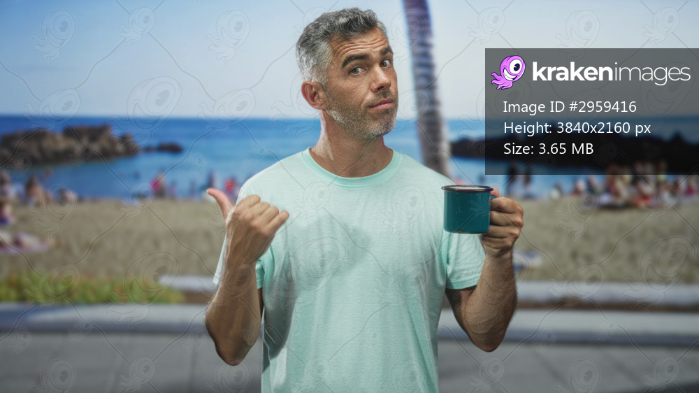 Man points thumb to beach holding a mug and giving a wry shrug with grey hair visible; relaxed contemplation.