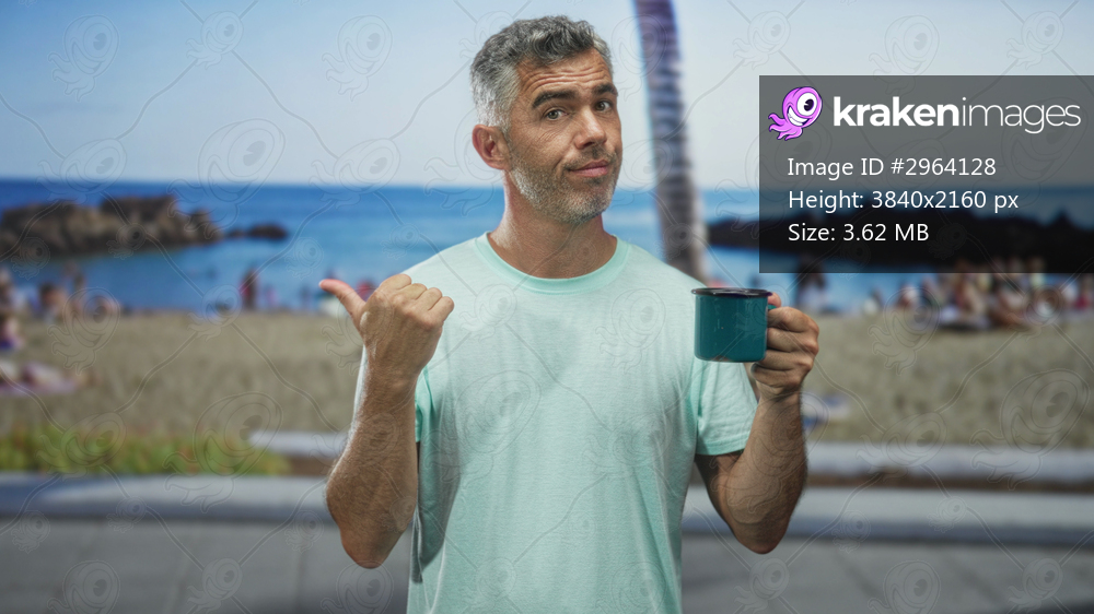 Man points thumb to beach holding a mug and giving a wry shrug with grey hair visible; relaxed contemplation.