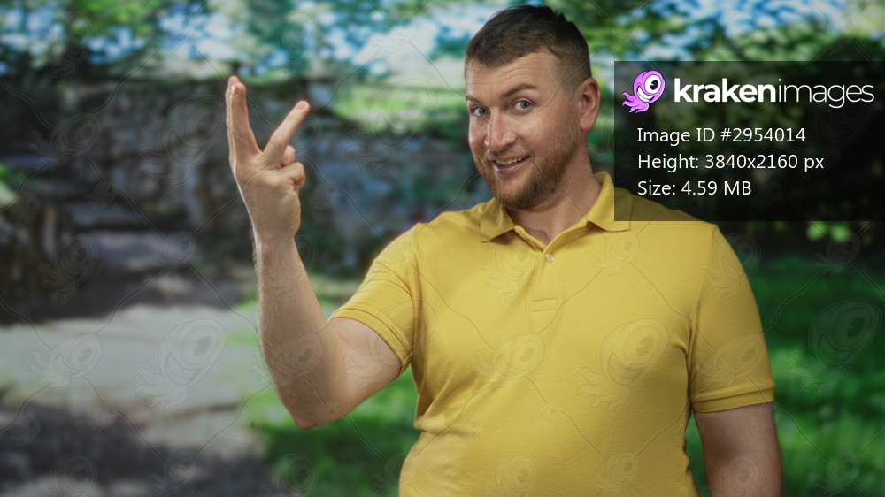 Man points two fingers and holds an open hand in forest near a stone wall and sunlit green lawn; friendly invitation.