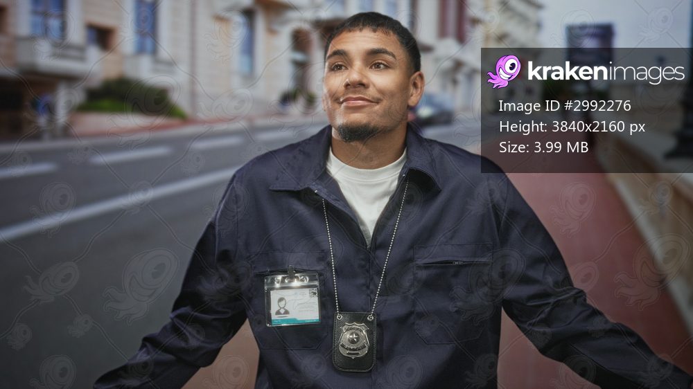 Man police badge and idcard smiling with visible mouth on street near building and sidewalk; approachable confidence.