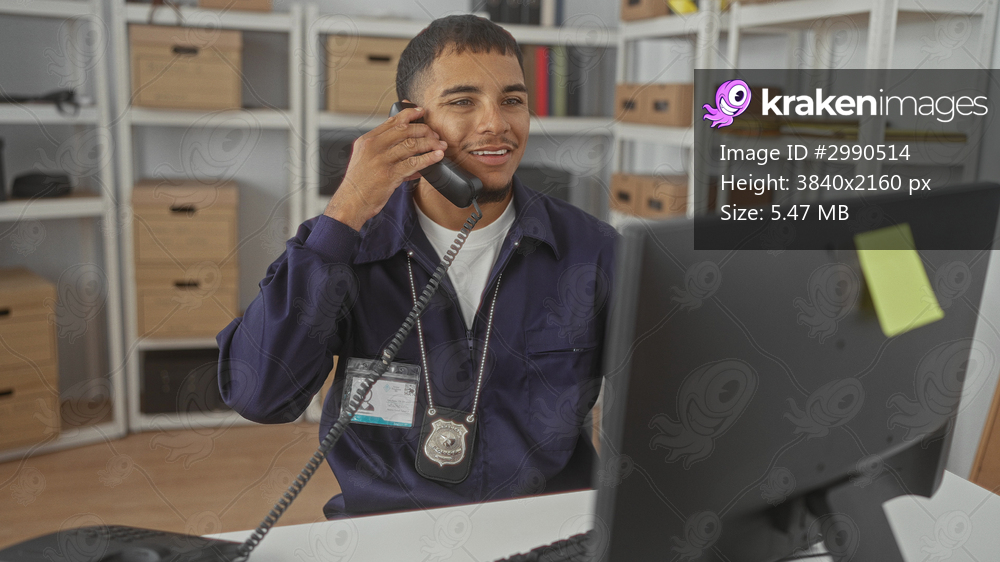Man police detective holding phone to ear with badge visible at desk with computer in building; duty professionalism.