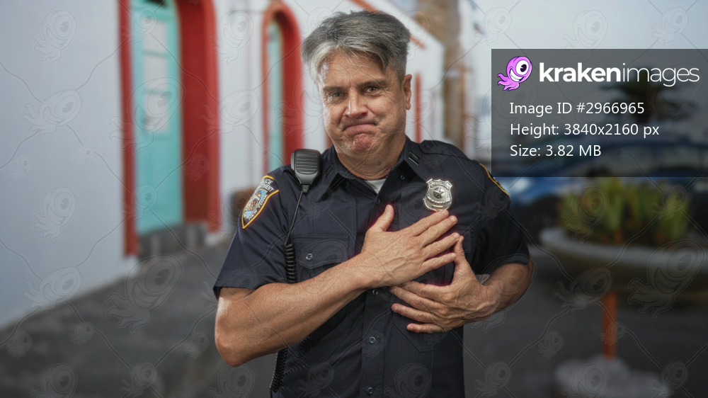 Man police officer with badge clutching hand to chest on street building, radio on shoulder; regret apology.