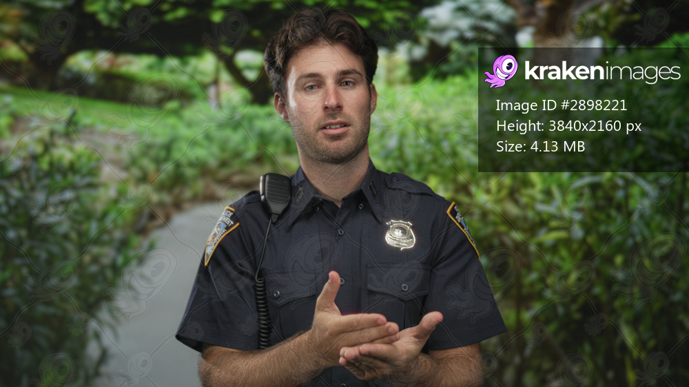 Man police officer clapping hands and speaking into radio on street with green park foliage and pathway; duty calm.