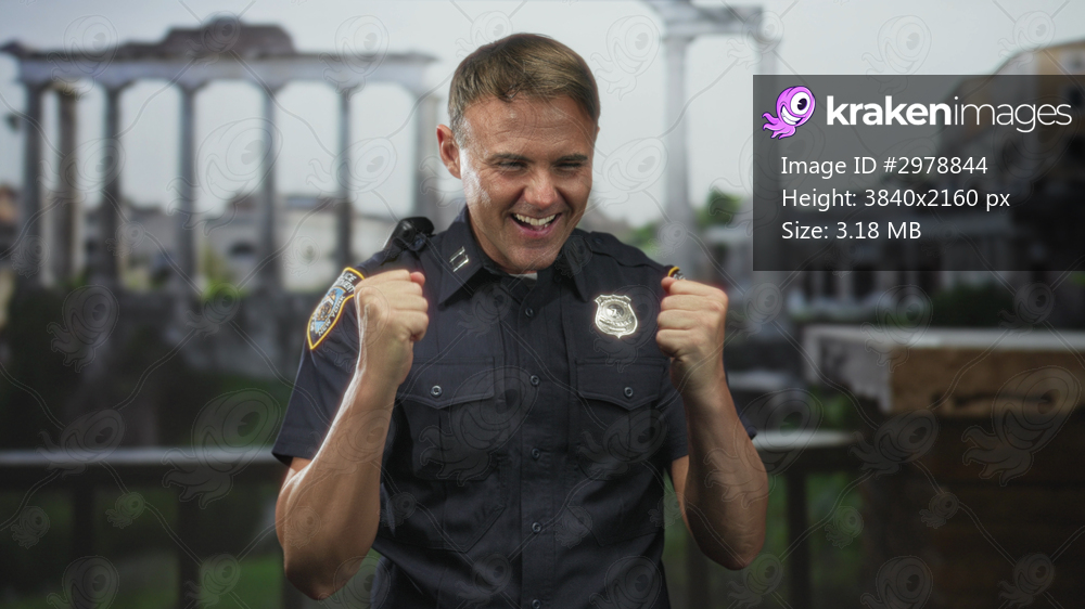 Man police officer with clenched fists celebrating and smiling in front of ruins building; triumph duty.