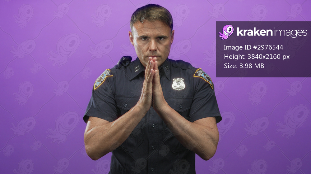Man police officer with hands pressed together in prayer gesture, badge on chest and forearms exposed against purple studio backdrop; solemn duty.