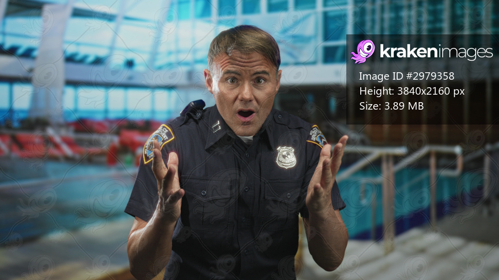Man police officer with hands raised and palms out near glass skylight and rows of seats in an airport terminal; surprise.
