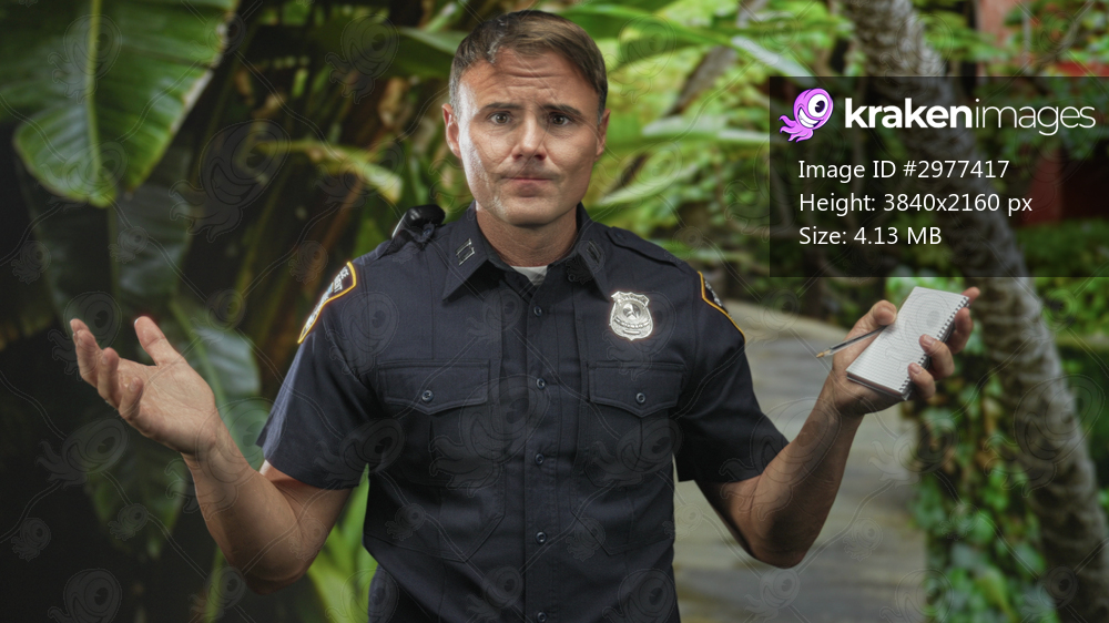 Man police officer holding spiral notepad and pencil, palms open in a shrugging gesture on a street walkway; concern duty.