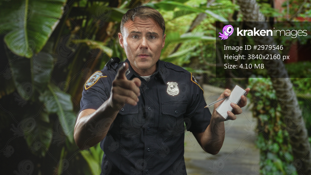 Man police officer holding spiral notepad and pencil, palms open in a shrugging gesture on a street walkway; concern duty.
