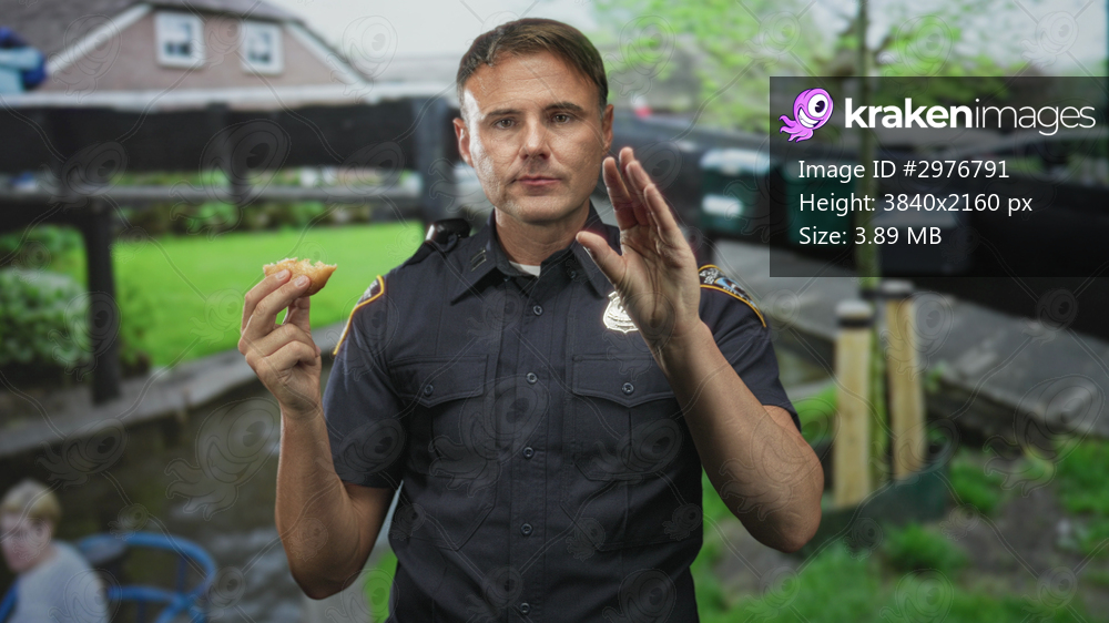 Man police officer holds a pastry in hand and gestures with the other hand while inspecting a snack by a street canal; curiosity pause.