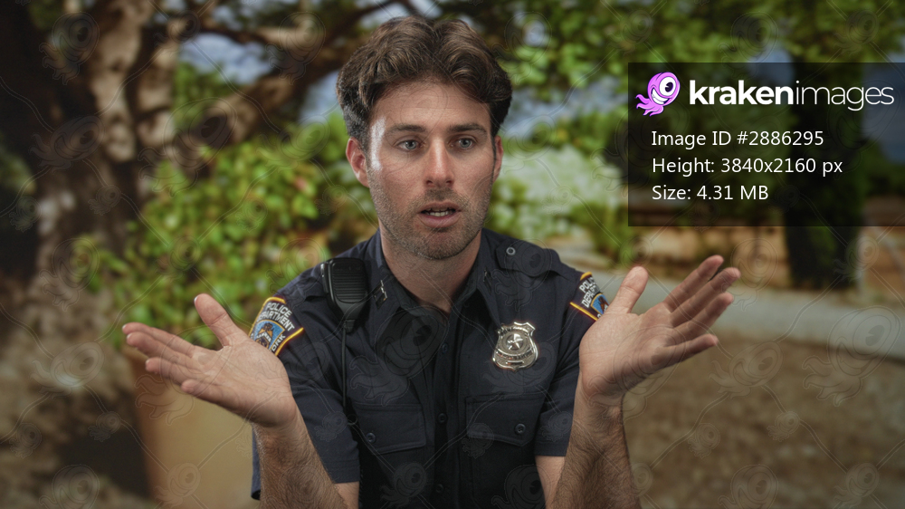 Man police officer with open palms gesturing in park near potted tree, badge and radio visible; duty concern.