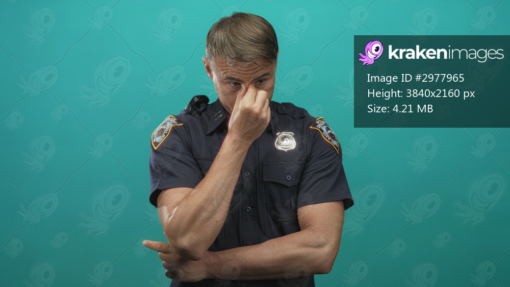 Man police officer pinches nose with hand, arms crossed, against turquoise studio backdrop; fatigue reflection.