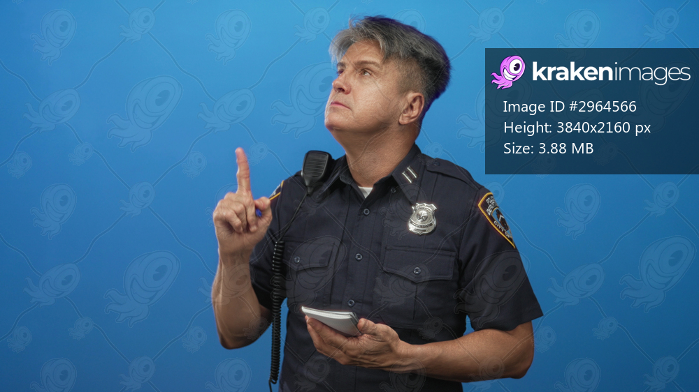 Man police officer pointing finger upward while holding notepad and radio in studio; authority duty.