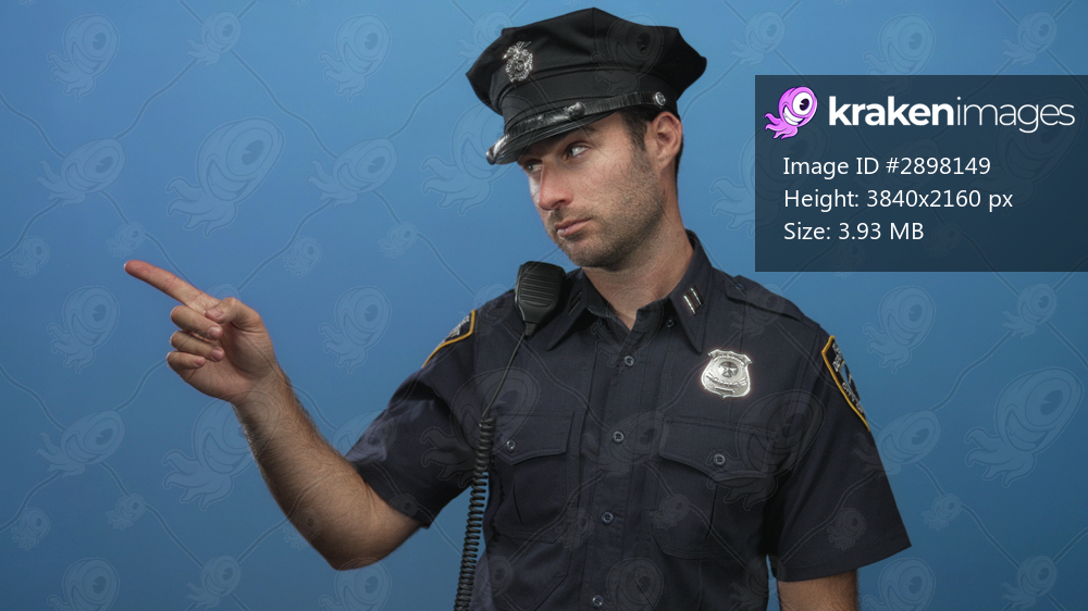 Man police officer pointing finger, wearing uniform and visible badge in blue studio; duty authority.