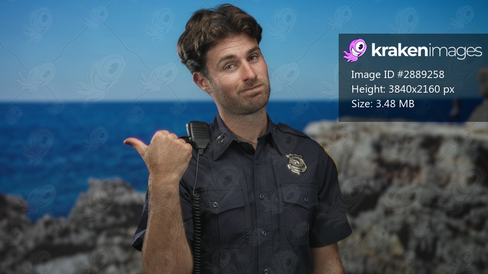 Man police officer pointing thumb toward sea on street set with radio on shoulder; casual authority amusement.