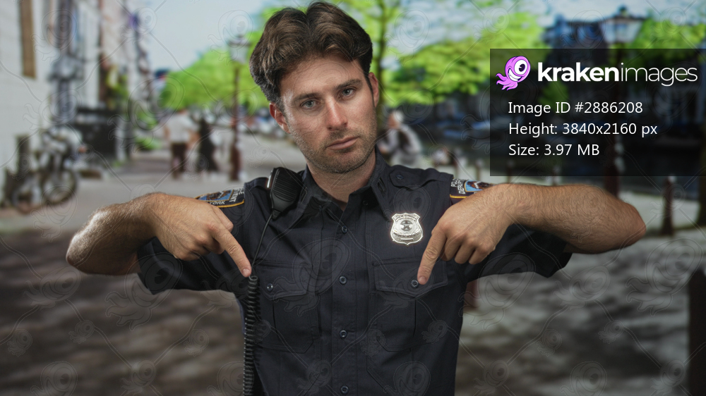 Man police officer points fingers down on street canal promenade showing badge and radio; duty authority.