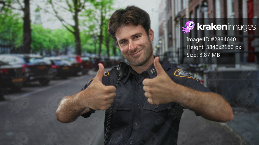 Man police officer smiling and giving double thumbs up with badge and radio on shoulder on a city street lined with parked cars; pride duty.
