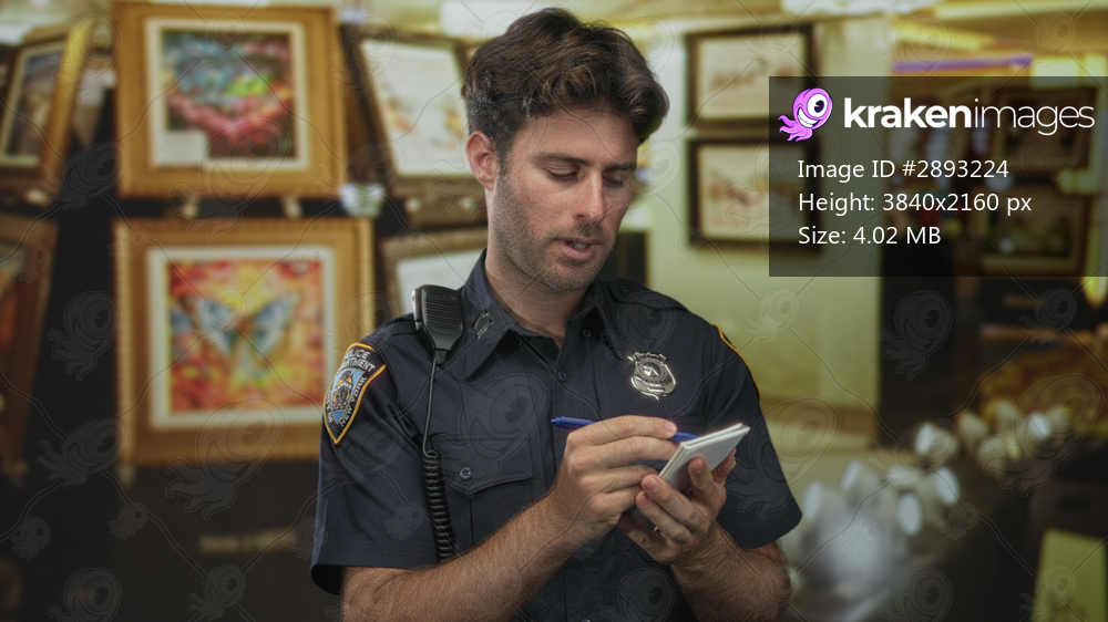 Man police officer writing on notepad holding pen with badge and radio visible amid framed paintings in building; duty security.