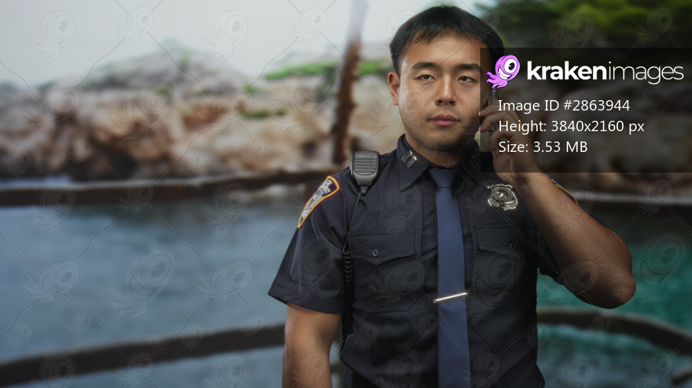 Man policeman in navy blue uniform holds smartphone to ear with walkietalkie on shoulder by rocky seaside railing; vigilance duty.
