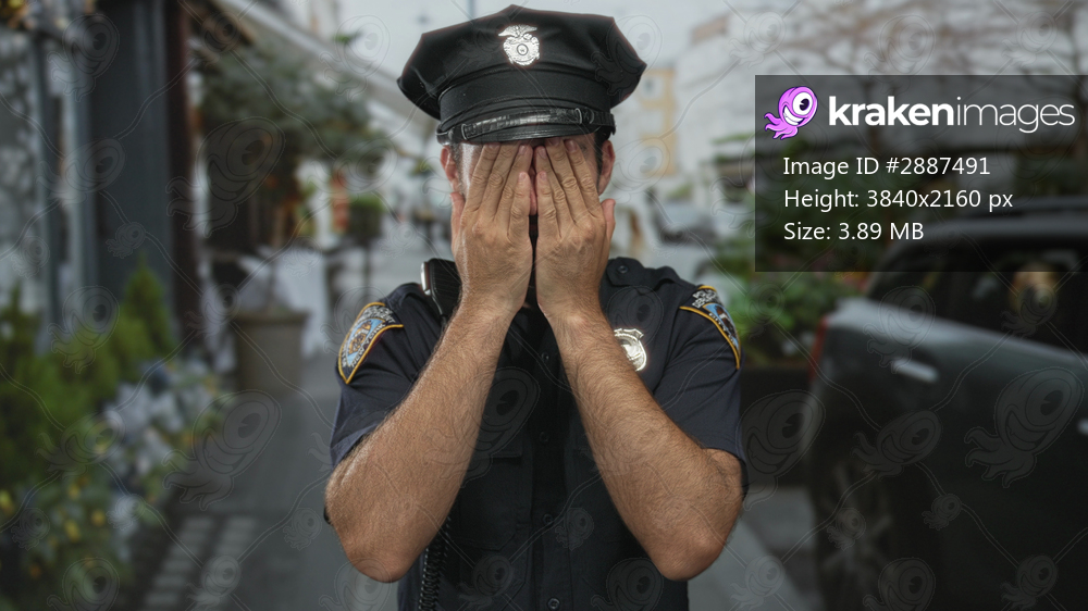 Man policeman smiling with badge visible on city street near parked car and sidewalk planter, radio mic on shoulder and cap in place; pride duty.