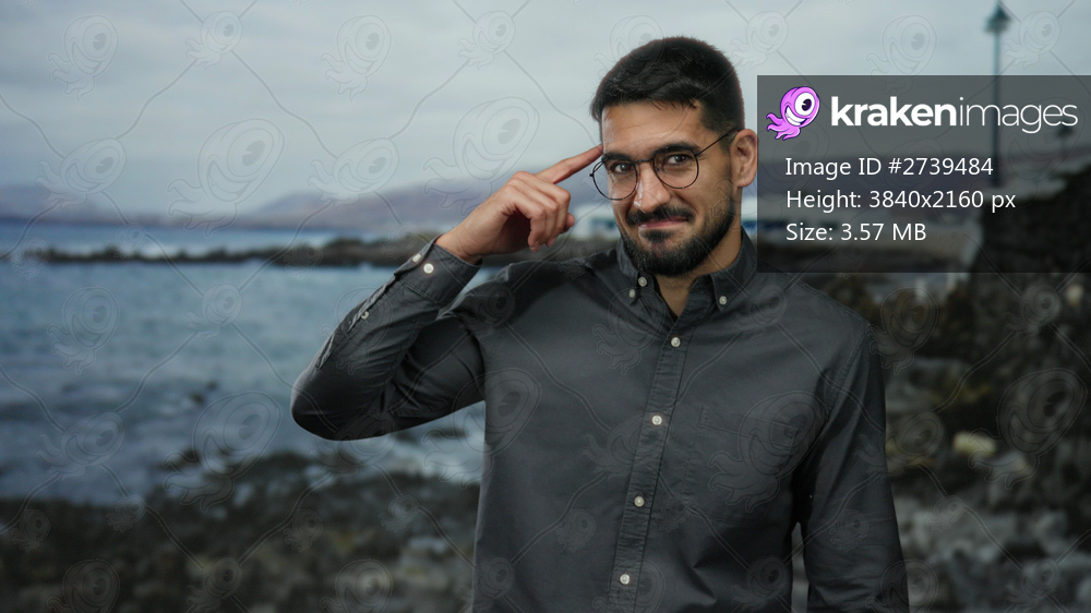 Man posing by the seaside with a thoughtful gesture wearing glasses in an outdoor beach setting with a mountainous background.