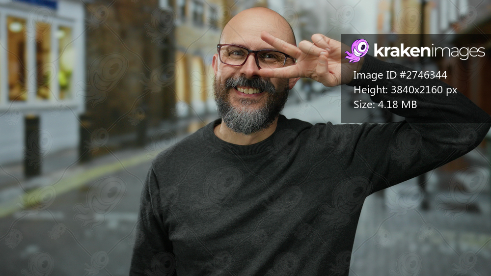 Man posing with peace sign in a casual sweater on an urban street with blurred background, showcasing a cheerful and relaxed demeanor.