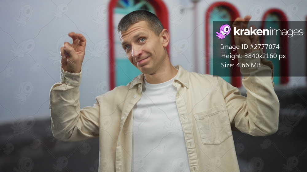 Man posing playfully on a vibrant street with colorful doors in the background demonstrating casual outdoor fashion and expression.