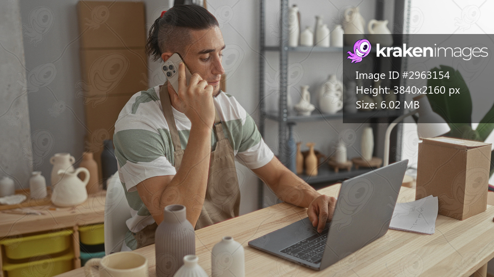 Man potter holds phone to ear and types on laptop while packing a box in pottery studio; concentration small business shipping.
