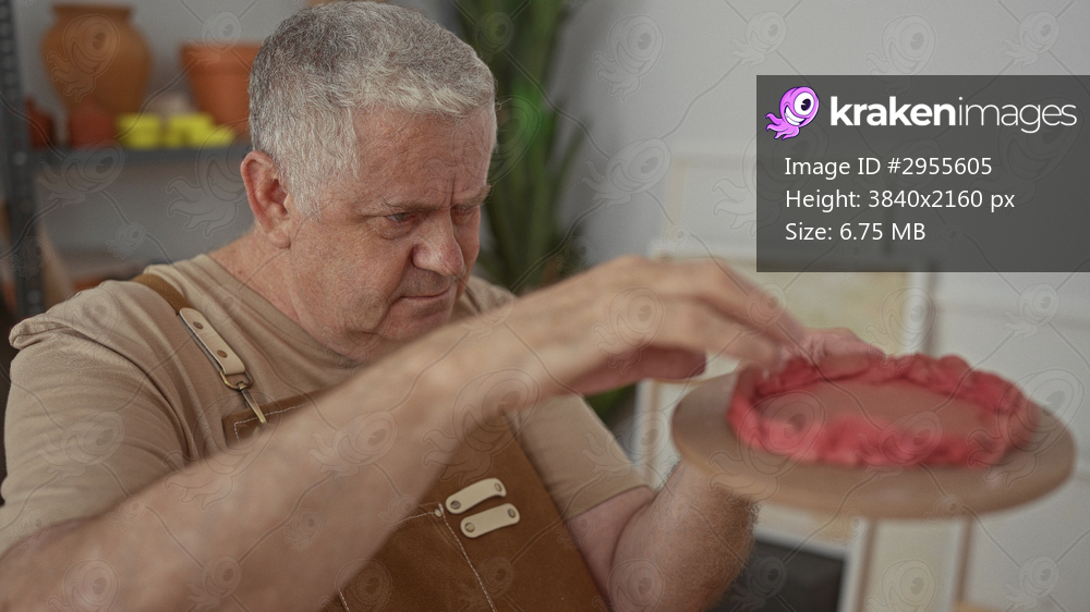 Man potter wearing apron shapes red clay with hand on wooden bat and trims rim in studio; concentration craftsmanship patience.