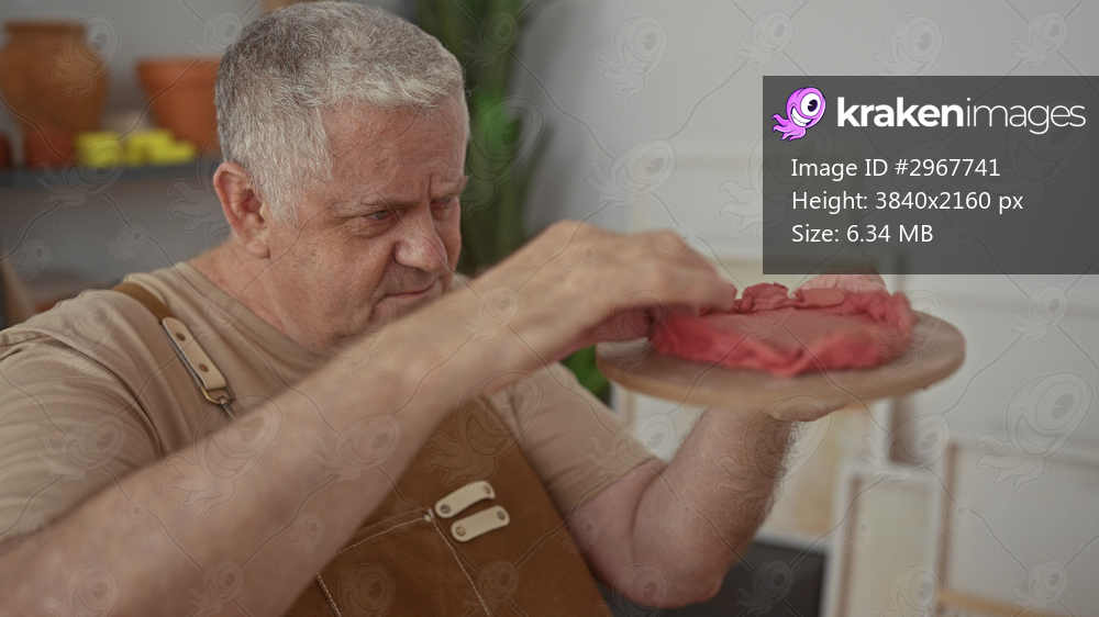 Man potter wearing apron shapes red clay with hand on wooden bat and trims rim in studio; concentration craftsmanship patience.