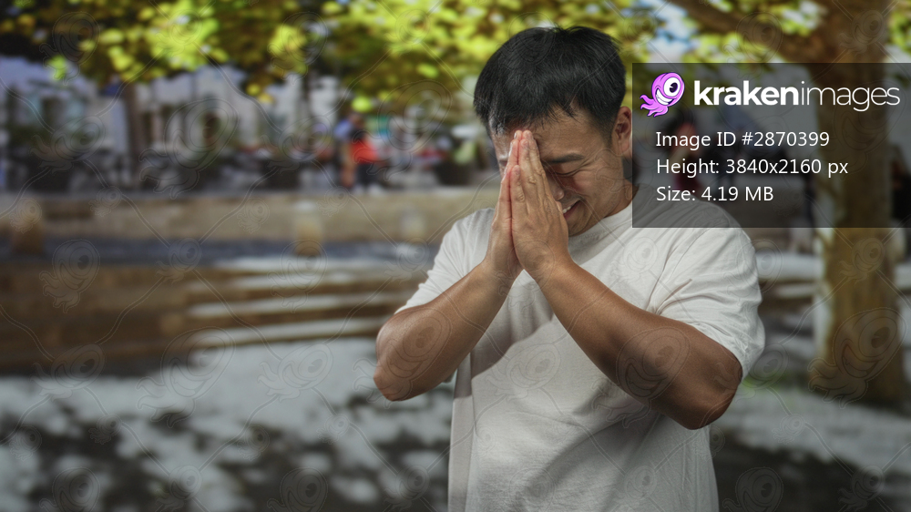 Man praying with clasped hands and closed eyes on busy city street by sidewalk and buildings under green canopy; gratitude.
