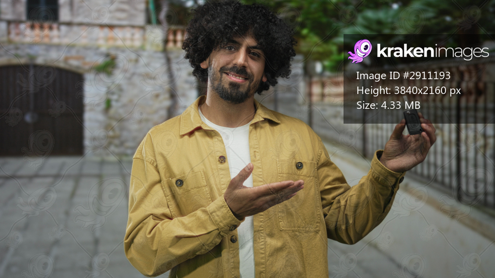Man presenting car key with open hand on a stone street near a gated entrance and iron fence, smiling while showing the key; friendly trust.