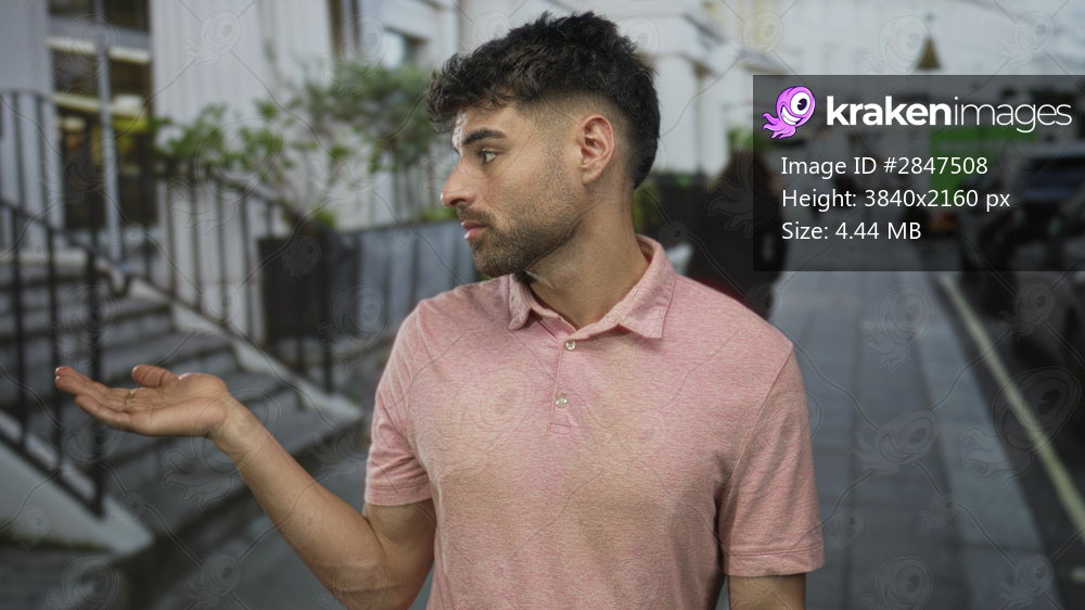 Man presenting open hand palm up on a city street in front of white building with stone steps and blurred pedestrians passing by; uncertainty.