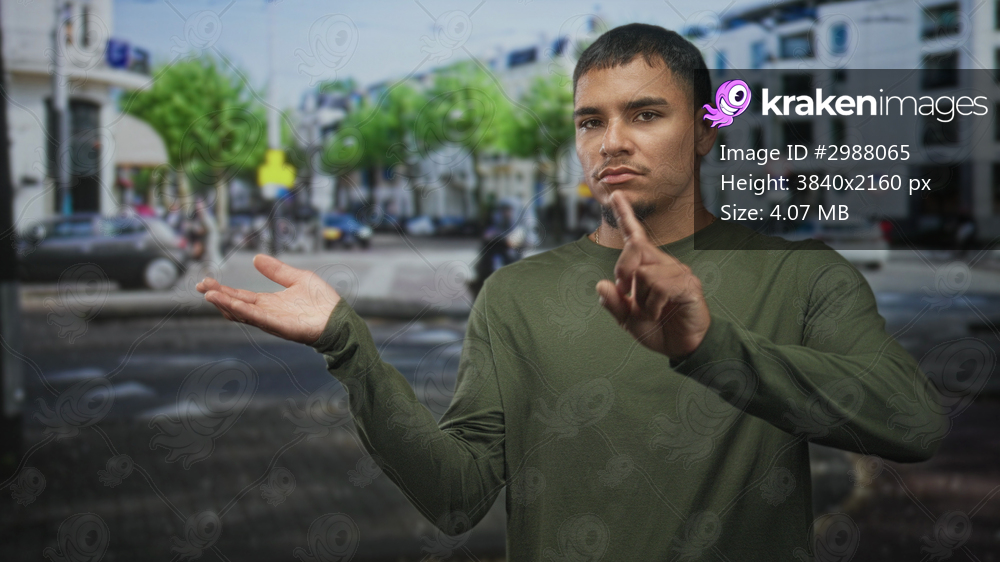 Man presenting open hand and pointing finger at invisible object in a busy city street intersection with cars and buildings; assertive instruction.