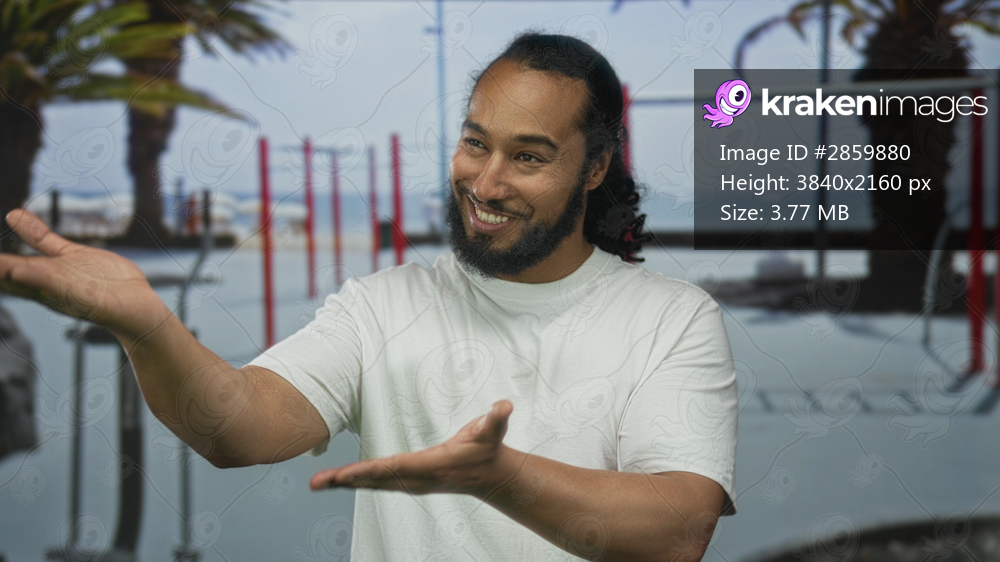 Man presenting with open hands, smiling and speaking in an outdoor gym near palm trees and beachside pullup bars; friendly invitation.