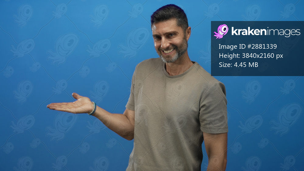 Man presenting open palm and gesturing with hand in blue studio, wearing casual t shirt and bracelet while smiling at camera; friendly invitation.
